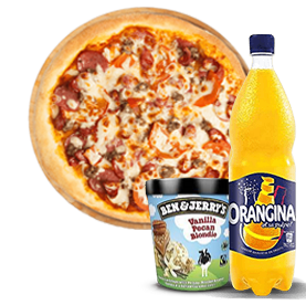 1 Pizza méga au choix + Ben & jerry's 500ml + 1 Orangina 1.5l.