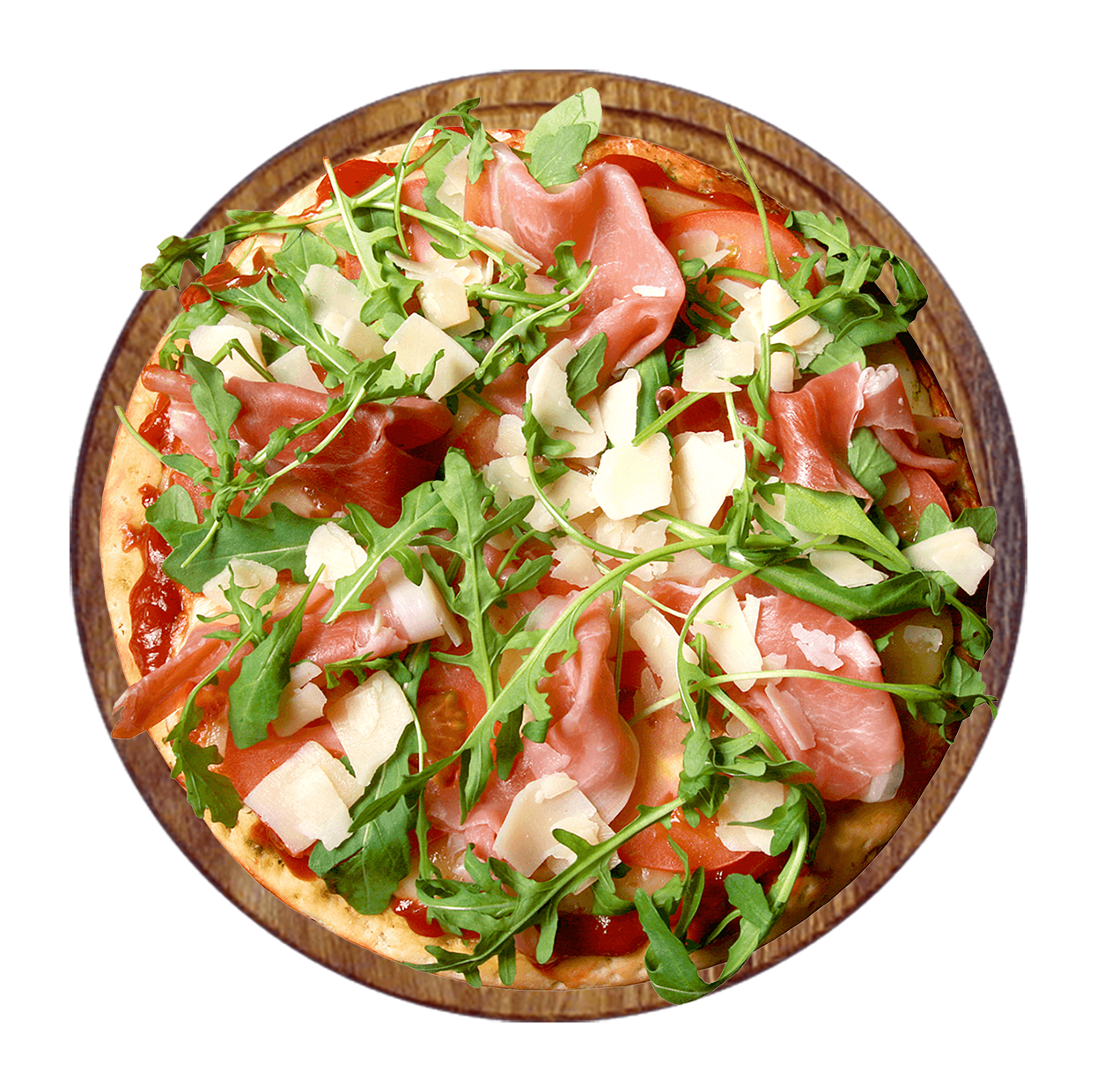 Sauce tomate, mozzarella, jambon, tomates cerises, roquette, parmesan grana padano AOP, huile d'olive.