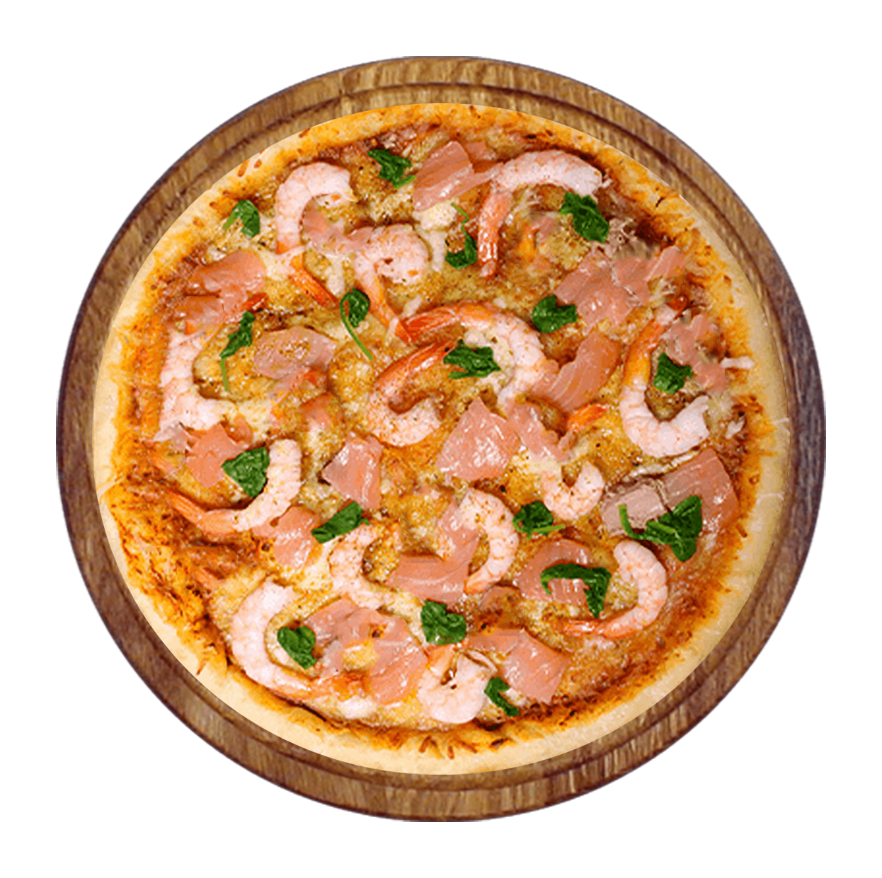 Sauce tomate, mozzarella, tomates, saumon fumé, crevettes.