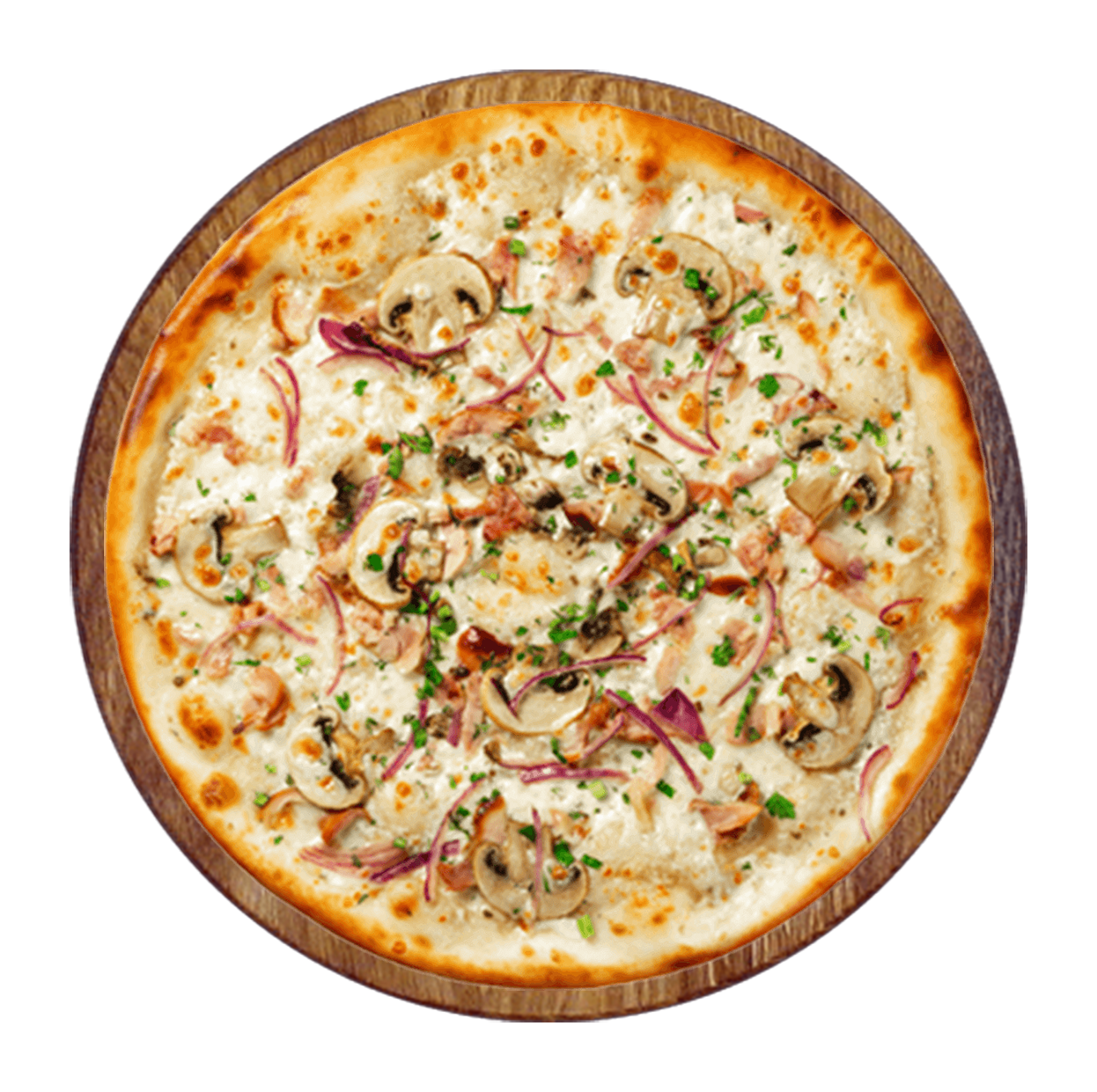 Crème de truffe, mozzarella, lardons, champignons, oignons.