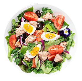 Salade verte, tomates, olives, oeuf, thon. Servie avec pain maison et sauce salade.