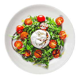 Salade verte, tomates confites, burrata, huile d'olive. Servie avec pain maison et sauce salade.