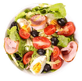 Salade verte, tomates, jambon de dinde, maïs, cornichons. Servie avec pain maison et sauce salade.
