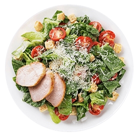 Salade verte, tomates cerises, filet de poulet, croûtons, sauce césar maison, copeaux de parmesan grana padano aop. Servie avec pain maison et sauce salade.