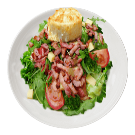 Salade verte, tomates, lardons de veau fumés, chèvre chaud. Servie avec pain maison et sauce salade.